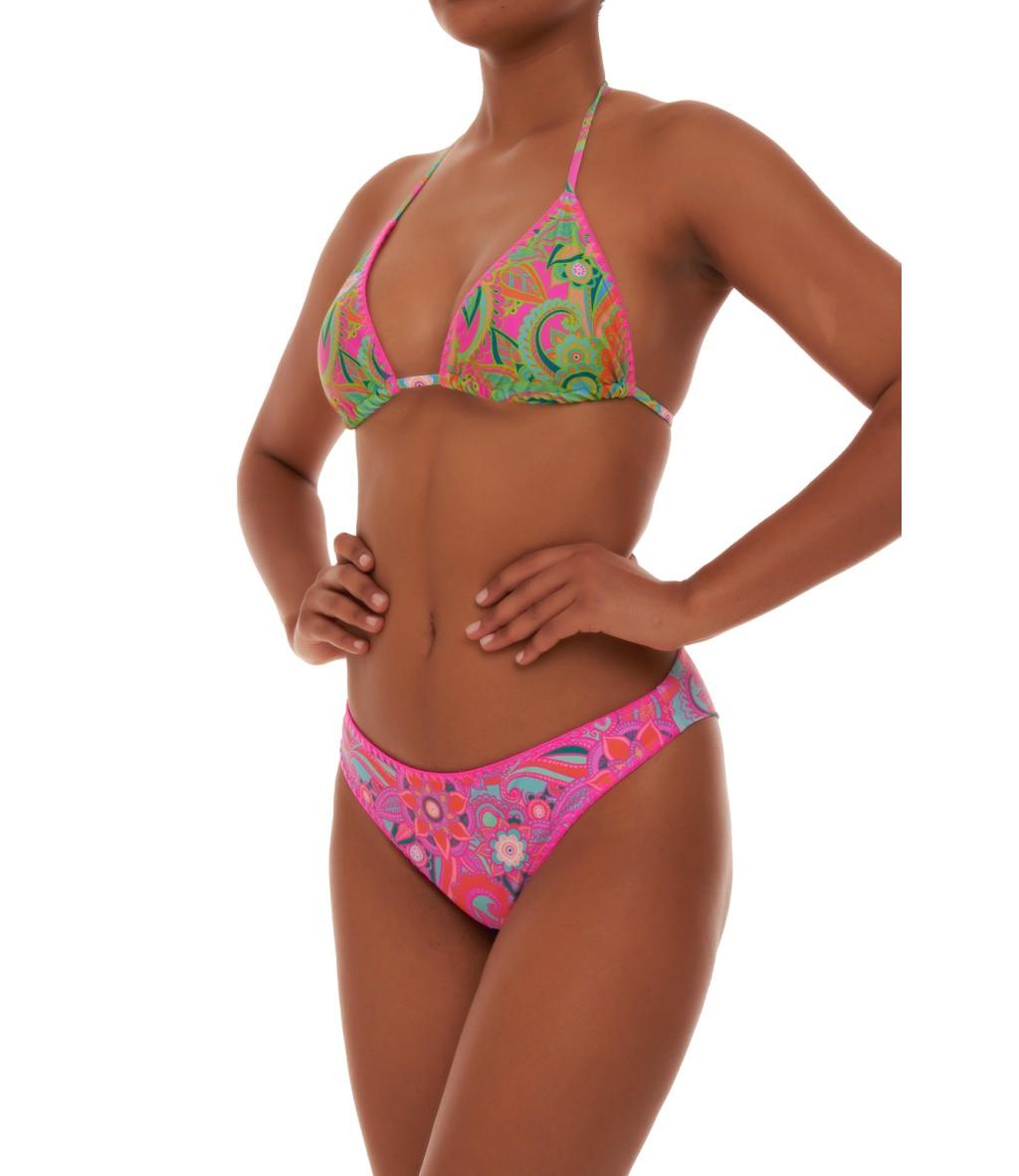 Bikini triangolo con coppe estraibili e brasiliana chiusa. Realizzato in morbida microfibra, che garantisce il massimo comfort nei movimenti. Di ispirazione hippie, sapore retrò, colorato, frizzante e allegro. Pensato per una donna spumeggiante. La tecnica di lavorazione crochet lo rende ancora più particolare.