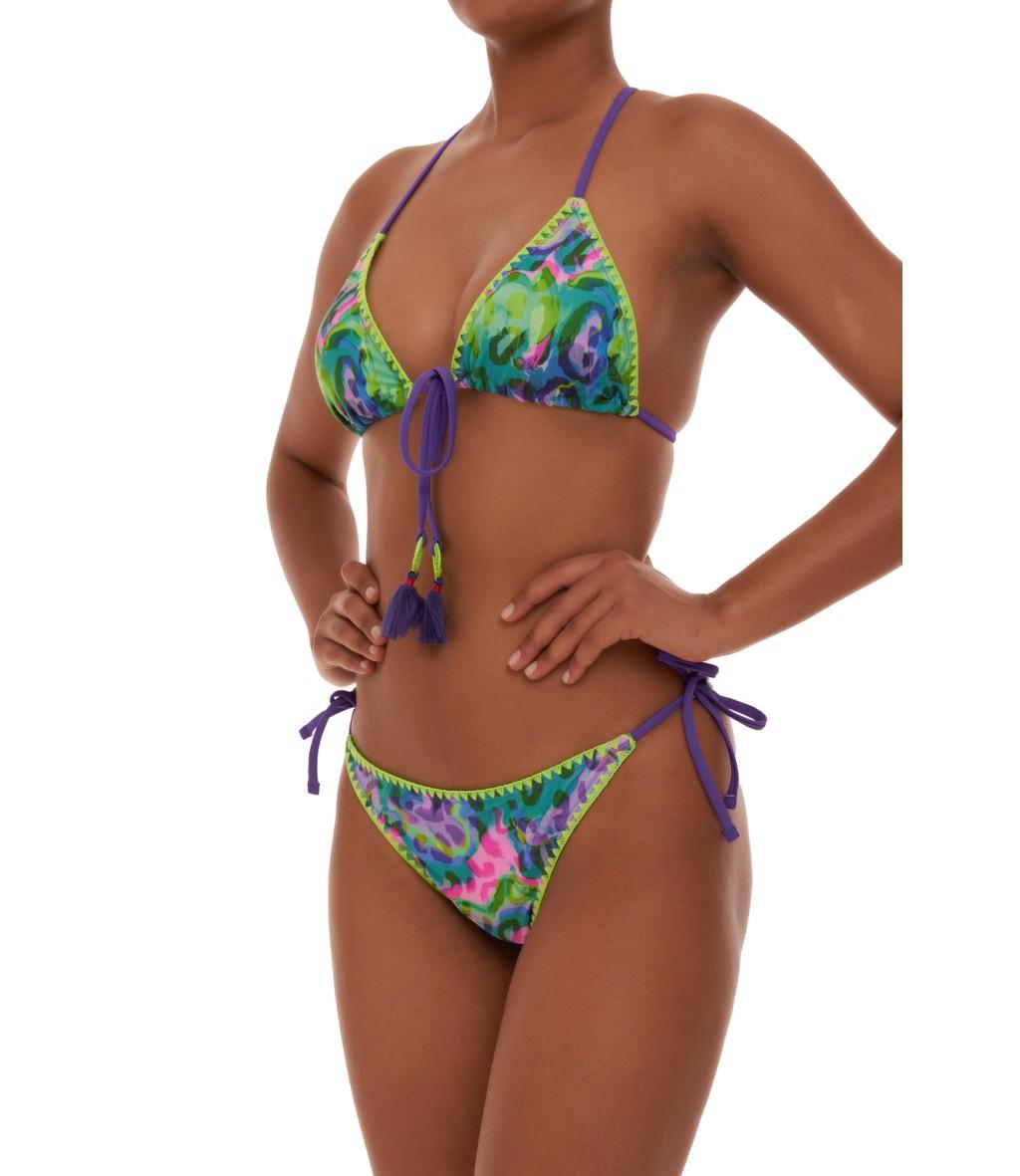 Bikini triangolo olimpionico con coppe estraibili e brasiliana regolabile con laccetti. Realizzato in morbida microfibra, per il massimo comfort nei movimenti. Stampa ispirata dalla tecnica di tintura del tie dye. Valorizzato dalla lavorazione crochet. Pensato per una donna che ama viaggiare.